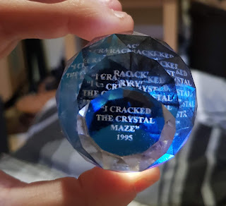 Yes! At last, childhood complete! I have been successful in acquiring an actual winner's Crystal from Series 6 of The Crystal Maze, (1995). The Crystal is engraved with the famous line 'I CRACKED THE CRYSTAL MAZE 1995'. It is incredible to think that this iconic prize Crystal is reaching 25 years old now. My bank balance has taken a bit of a big dent, but this has completed my extensive Maze memorabilia collection. Click on the images to take a closer look. Absolutely stunning, and I am currently smiling lots. As a die-hard fan, it has been my dream to have a real one. It is beautiful and a REAL Swarovski Crystal. They refract all kinds of colours of light.